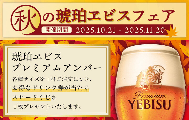 首都圏の銀座ライオン各店にて、秋にちなんだドリンクフェアを実施!「琥珀ヱビス プレミアムアンバー」を1杯ご注文につき、お得なドリンク券が当たるスピードくじを1枚進呈いたします。