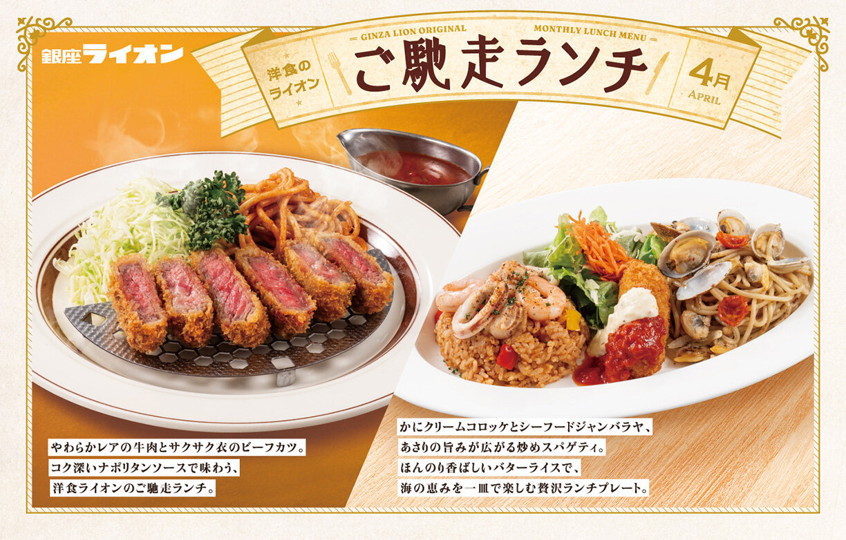 全国の銀座ライオン(一部店舗除く)がお届けする、月替わりの【平日限定】特別ランチ。4月のご馳走は「厚切りビーフのレアカツ」と「シーフードよくばりプレート」。