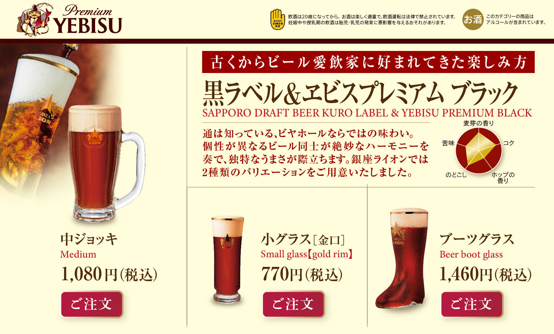 ヱビスプレミアムブラックの香ばしい薫りが絶妙なハーモニーを奏でる、専門店ならではの味わいです。 -