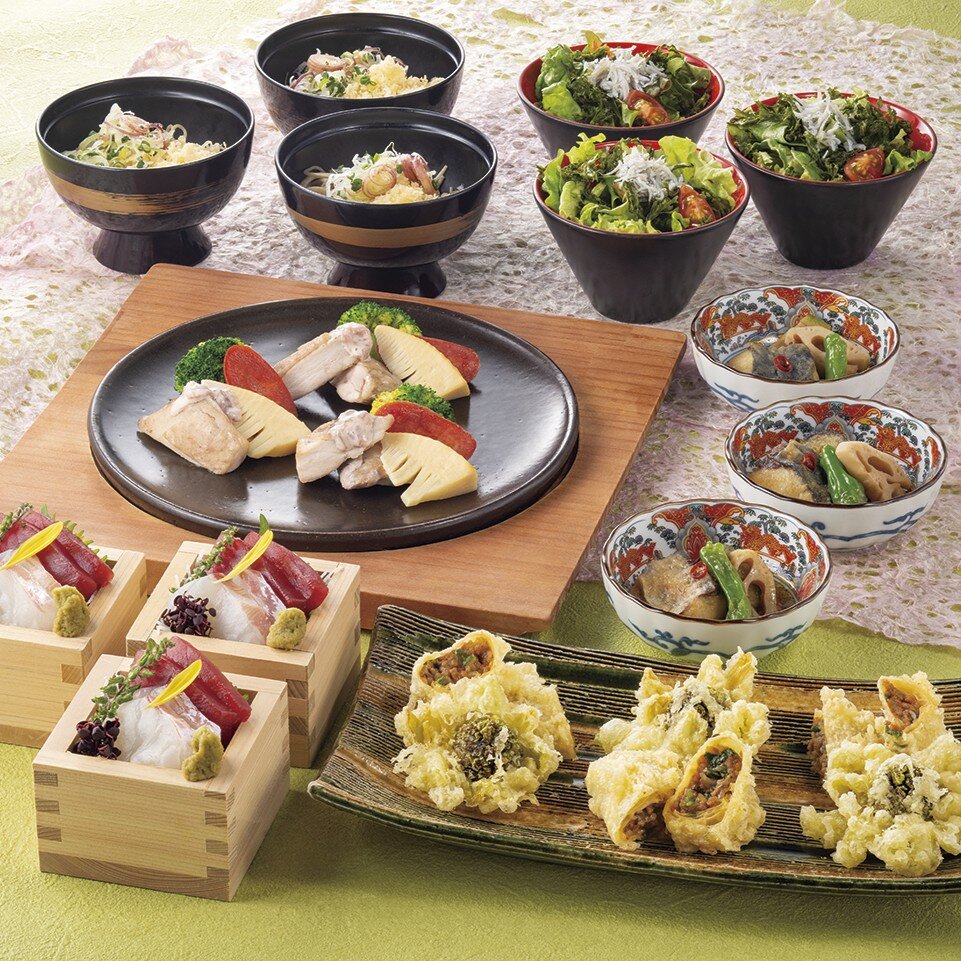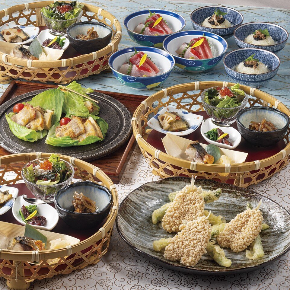 公式HP限定【プレミアム飲み放題150分/東風の宴】前菜から充実!花籠の彩り小鉢、本まぐろ含むお刺身三種、豚角煮炙り焼きなど充実のお料理