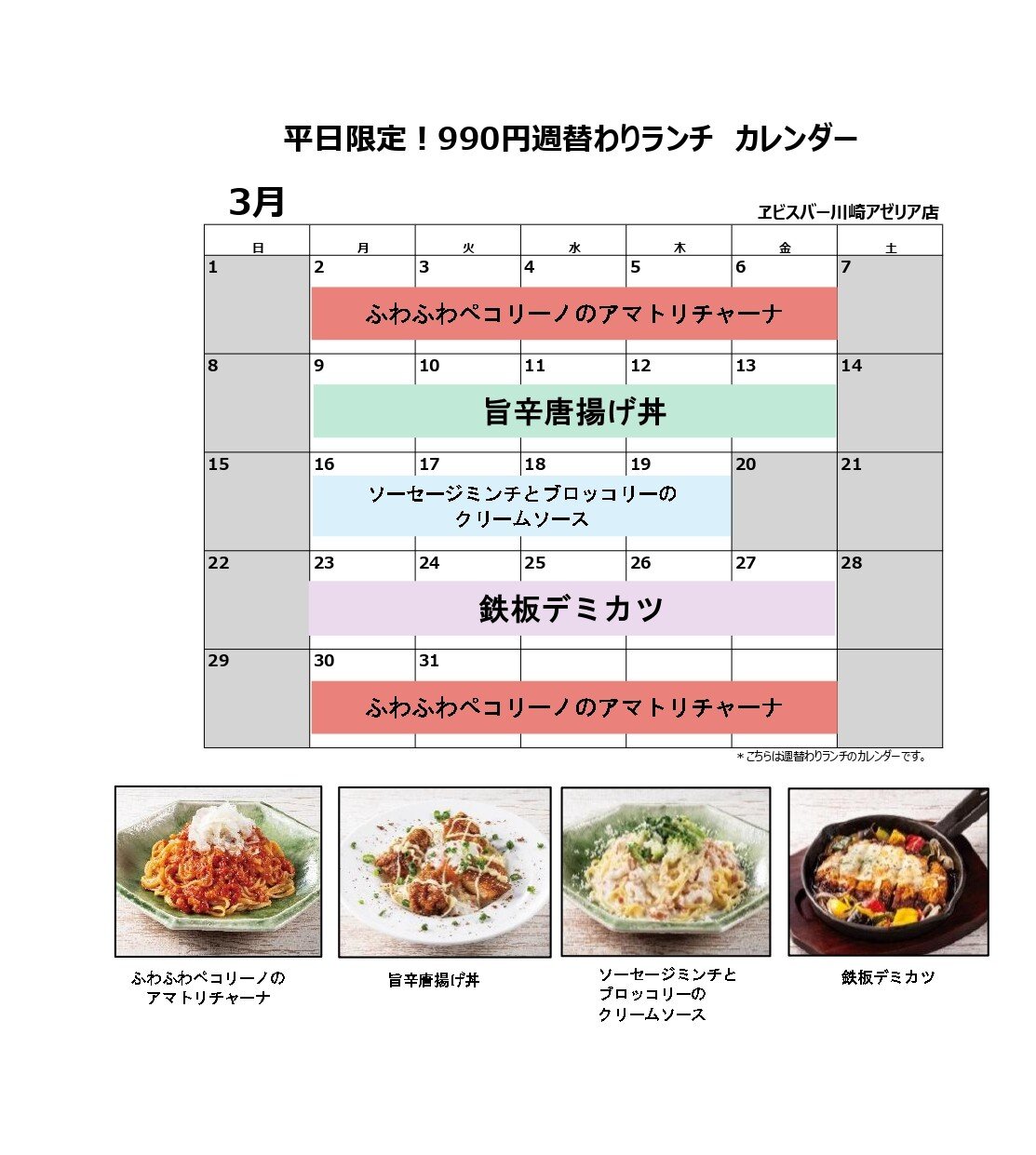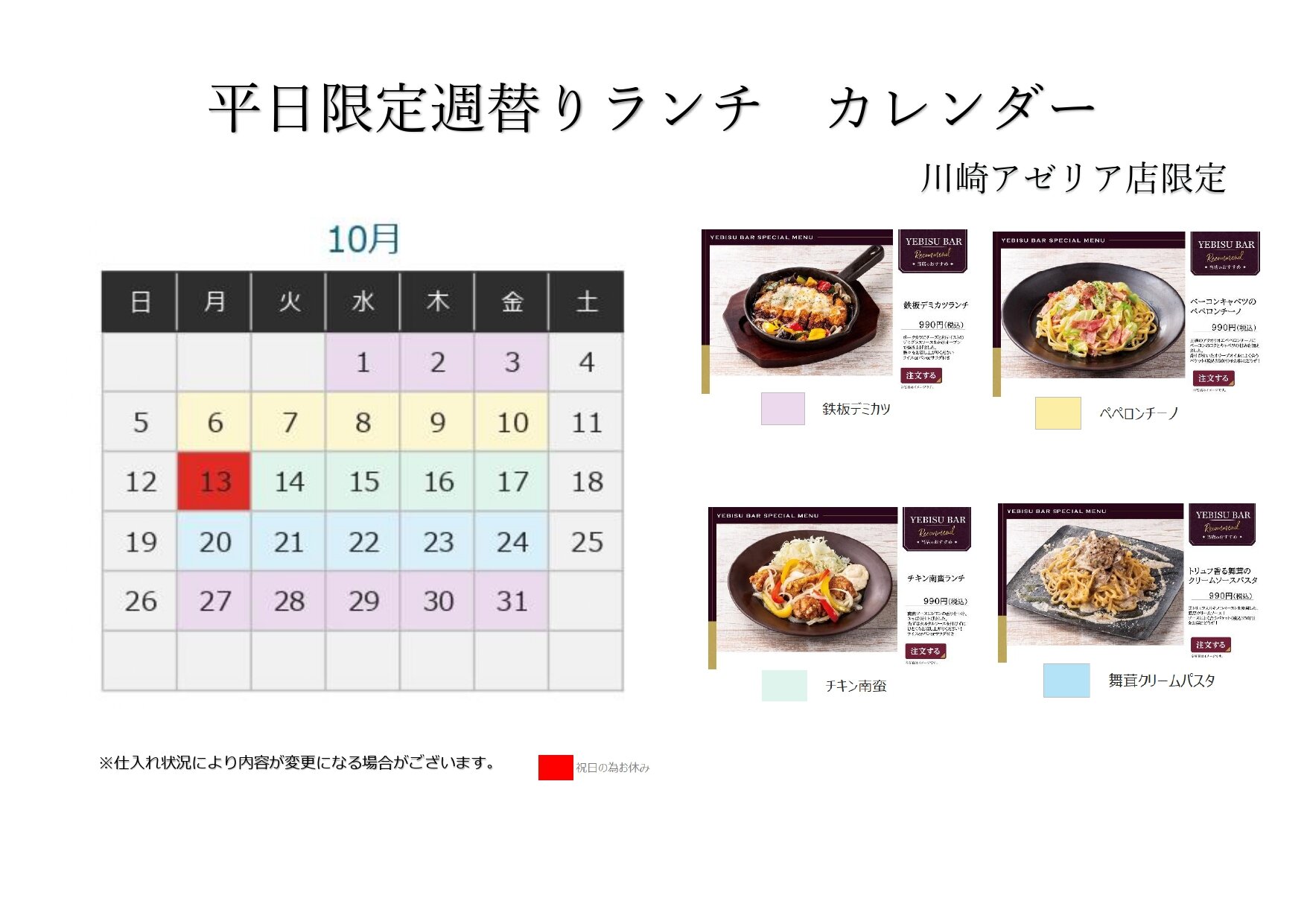 ヱビスバー川崎アゼリア店では平日限定、当店オリジナルの週替わりランチを販売中です。